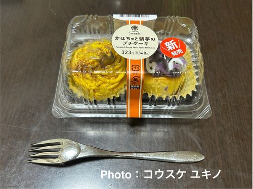 お疲れ様です! 自宅最寄り駅近くのファミリーマートで10月8日(水)、かぼちゃと紫芋のプチケーキを買いました。10月7日(火)より発売された一口サイズのケーキ2個です。 ・原材料等表記 ・フタを開けた状態のプチケーキ ・お皿に移していただきました ・購入…